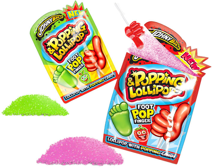 Klubbor I former av fot och tumme, med sockerkonfektyr att doppa i.Kommer i smakerna Jordgubb, Grönt äpple och väljs slumpmässigt.
